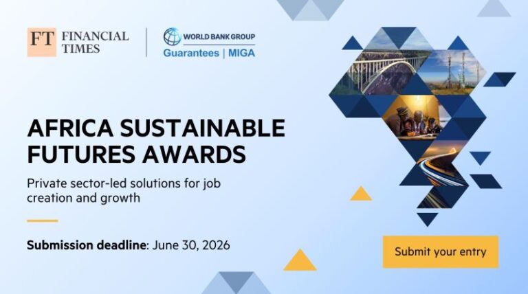 Applications are open for the Financial Times/MIGA Africa Sustainable Futures Awards 2026. The Financial Times and the World Bank Group’s Multilateral Investment Guarantee Agency (MIGA) have launched the third edition of the Africa Sustainable Futures Awards, a major annual programme that promotes innovative, private sector solutions to development challenges in Africa.