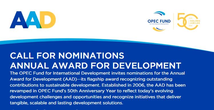 Applications are open for the OPEC Fund Youth Entrepreneurship Award 2026. The Annual Award for Development (AAD) recognizes outstanding contributions to sustainable development. First introduced in 2006, the AAD has evolved in OPEC Fund’s 50th Anniversary year to better reflect today’s development priorities and emerging opportunities.