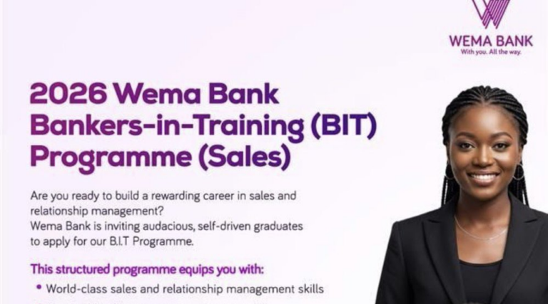 Applications are open for the Wema Bank Bankers-in-Training Program 2026. The Bankers-in-Training Program – Sales is designed to develop the next generation of banking leaders. Following an intensive, structured classroom training phase covering banking operations, financial products, and credit analysis, successful candidates will be deployed to the field.