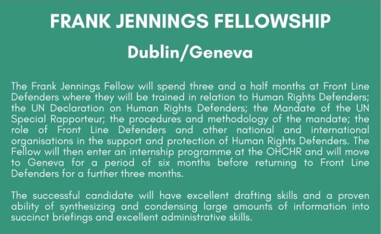Applications are open for the Frank Jennings Fellowship – April 2026. The FJ Fellow will spend three and a half months at Front Line Defenders Dublin office where they will be trained in relation to Human Rights Defenders; the UN Declaration on Human Rights Defenders; the Mandate of the UN Special Rapporteur; the procedures and methodology of the mandate; the role of Front Line Defenders and other national and international organisations in the support and protection of Human Rights Defenders. The Fellow will then enter an internship programme at the OHCHR and will move to Geneva for a period of six months before returning to Front Line Defenders for a further three months.