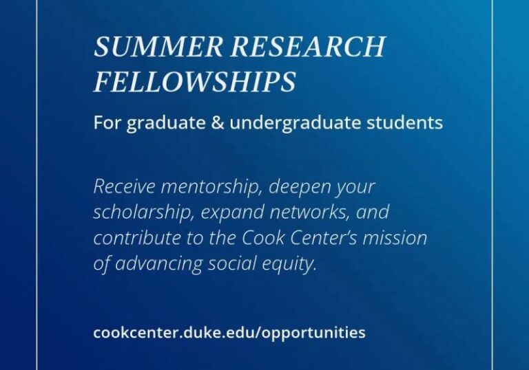 Applications are open for the Samuel DuBois Cook Center on Social Equity Graduate Summer Research Fellowships 2026. The Samuel DuBois Cook Center on Social Equity at Duke University invites applications from current Duke University graduate students for the 2026 Summer Research Fellowship. This program allows graduate researchers to receive mentorship, deepen their scholarship, expand their networks, and contribute to the Cook Center’s mission of advancing social equity.
